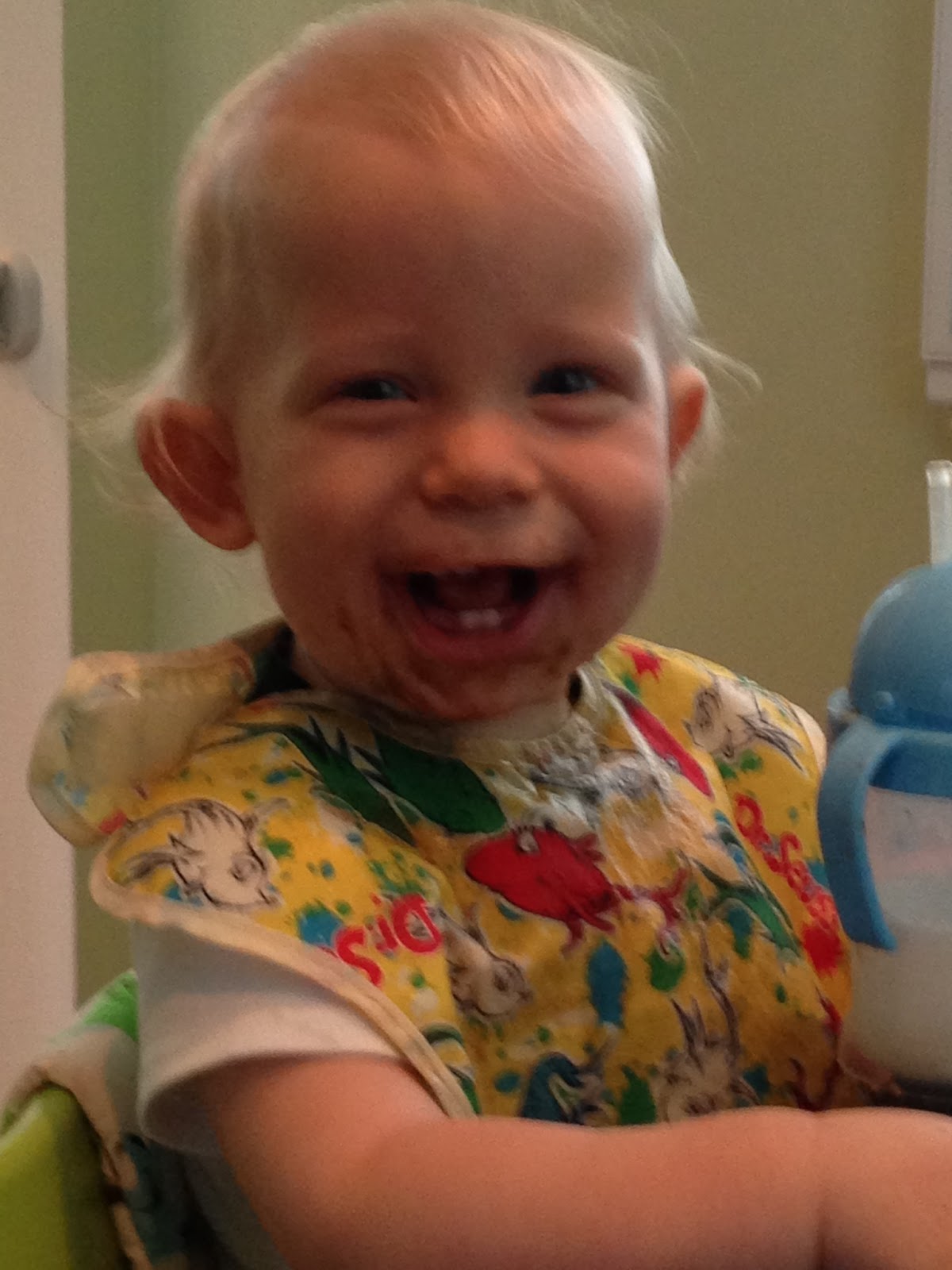 Kim's first birthday present to Carter. Can you tell he likes it? |